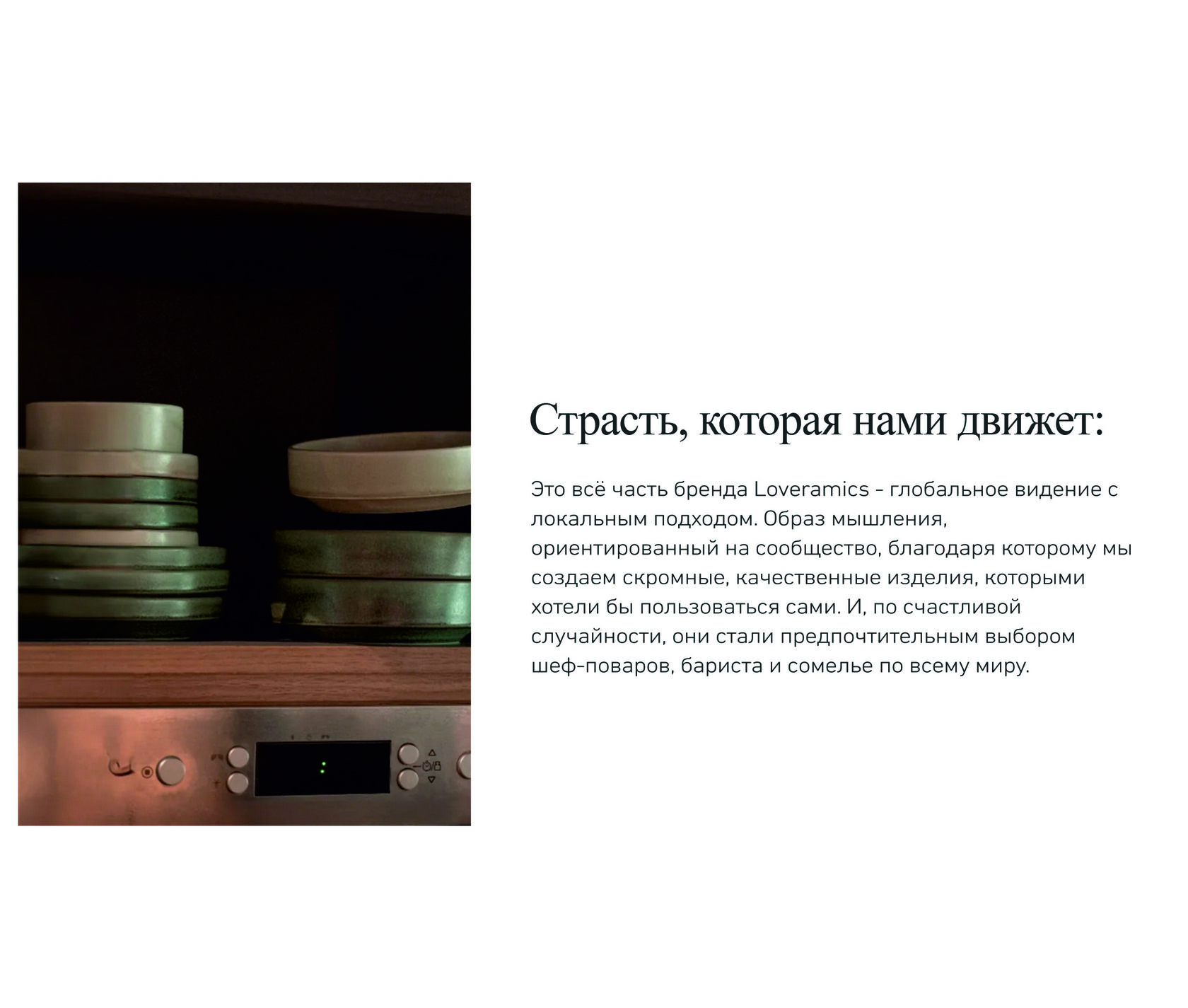 Loveramics - это международно признанный бренд керамики, ставший синонимом качества и мастерства. В Loveramics мы разбиваем пресловутые шаблоны гончарного искусства. Разрушаем стереотипы классических и формальных подходов, создавая стильные современные дизайны, в каждом из которых воплощена наша страсть.