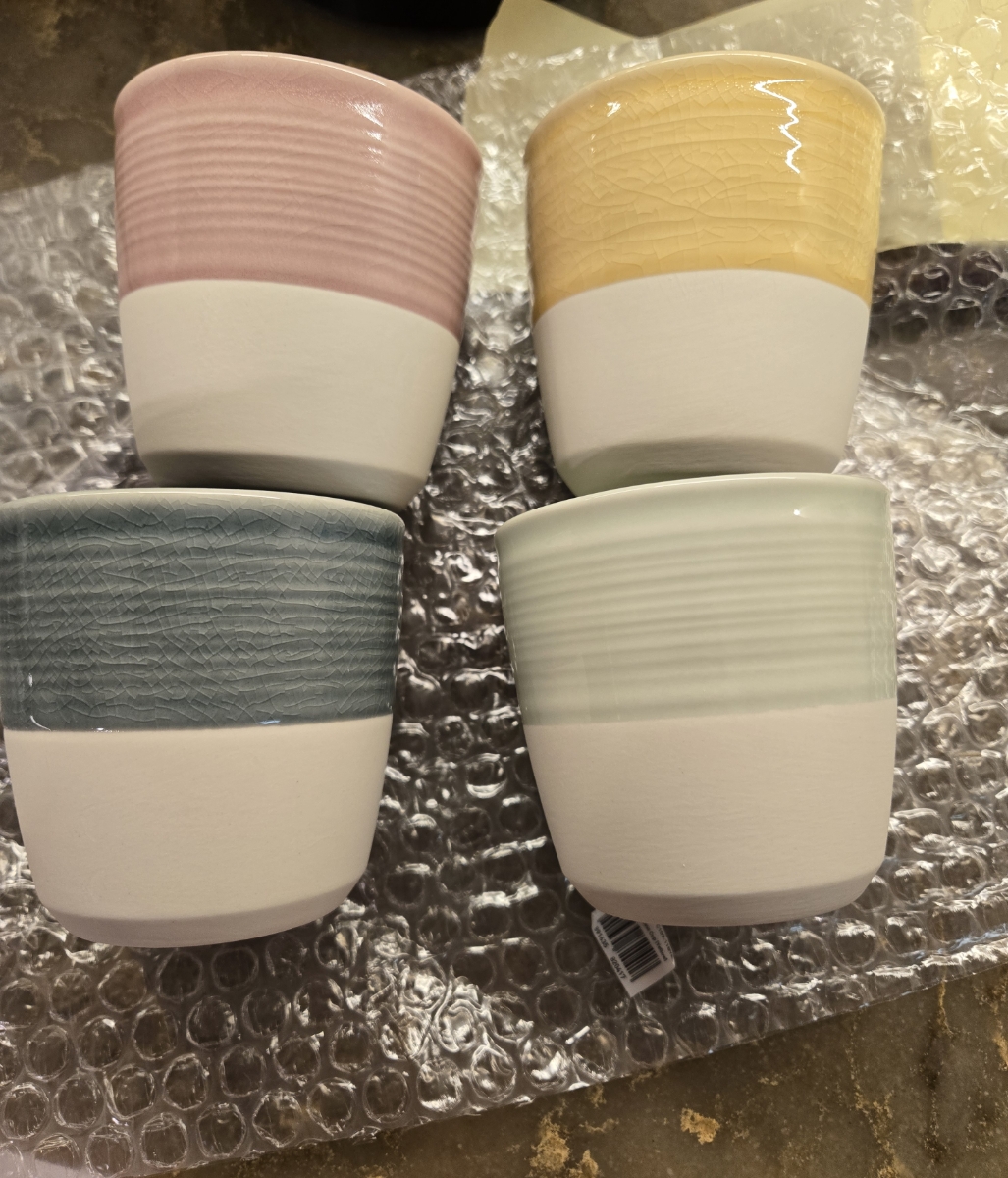 очень понравились чашки, не знала какой цвет выбрать, взяла 4 разных. глазурь на всех чашка по разному выглядит, где то ровно лежит , а где то эффект потрескавшийся.