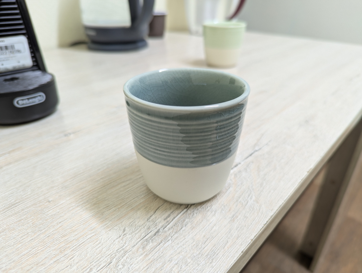 Очень красивая чашка, приятно держать в руках, нравится именно формат стакана без ручки. Идеальный размер: не большая, не маленькая, на тот случай, когда кружки для эспрессо мало, а стандартной чайной слишком много. Когда только наливаешь кофе, стенки греются, может быть горячо держать в руке, но довольно быстро адаптируется. Брала на пробу, теперь хочу заказать еще в разных цветах