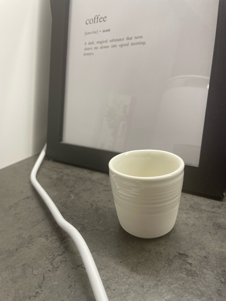 Тактильно очень приятная чашка. Хорошо держит температуру эспрессо.