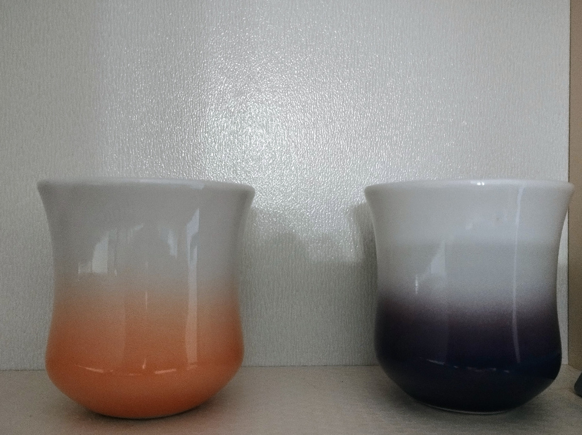 оранжевая чашка окрашена менее насышенно, по сравнению с фиолетовой.