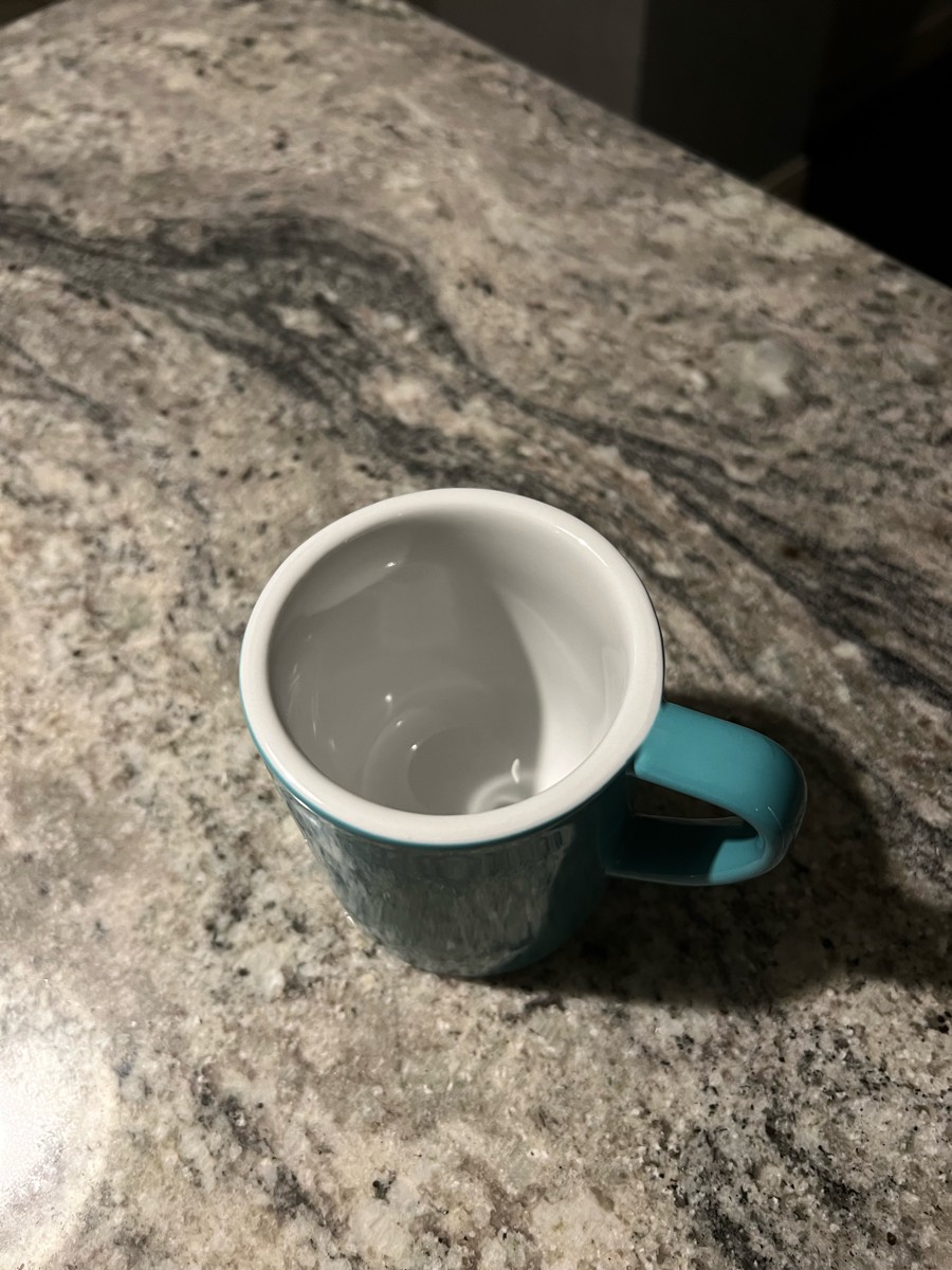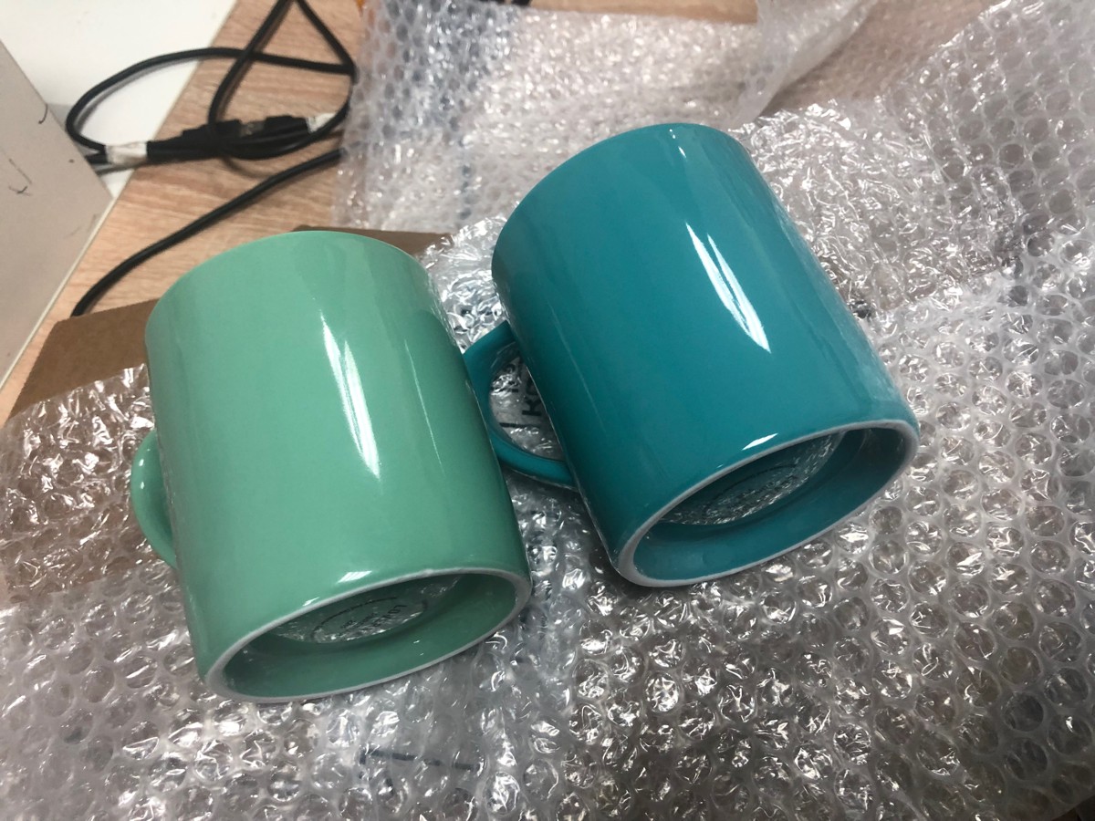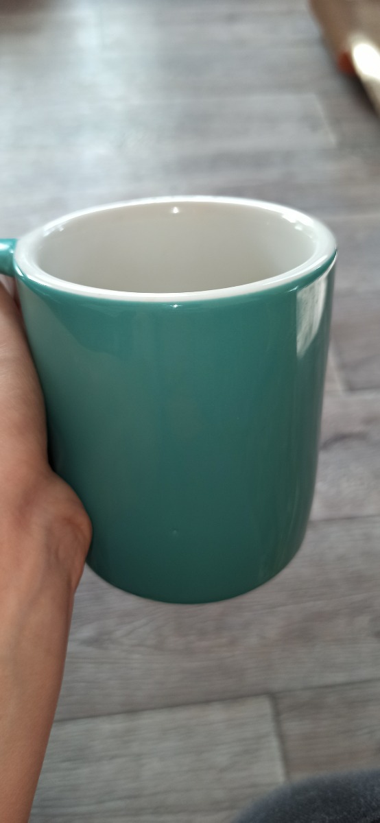 Спасибо большое! Кружки отличного качества. Была одна из них, очень долго прослужила, но неудачно упала и разбилась, при чём на крупные куски. Увесистая 553г. Выбрали того цвета, что и была мятного цвета.