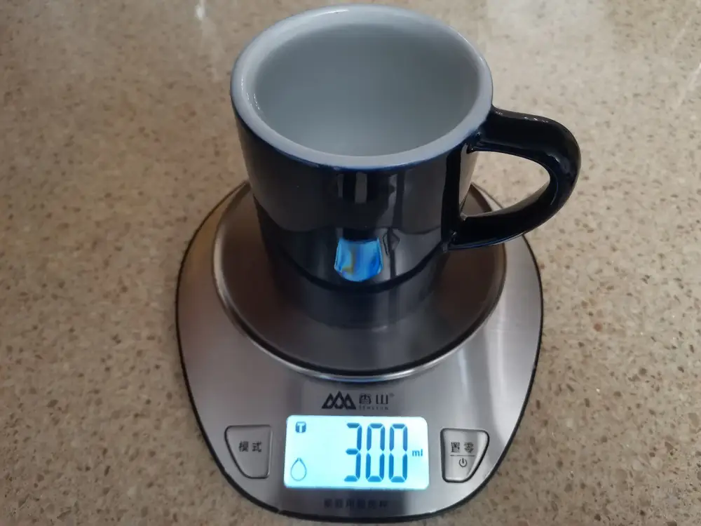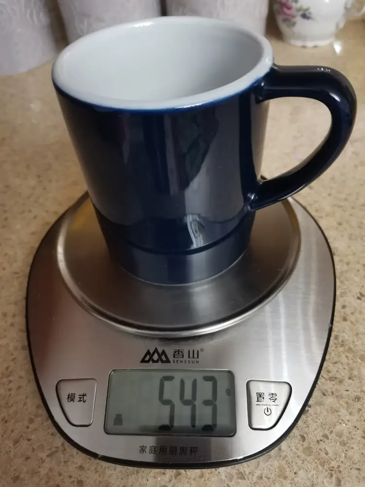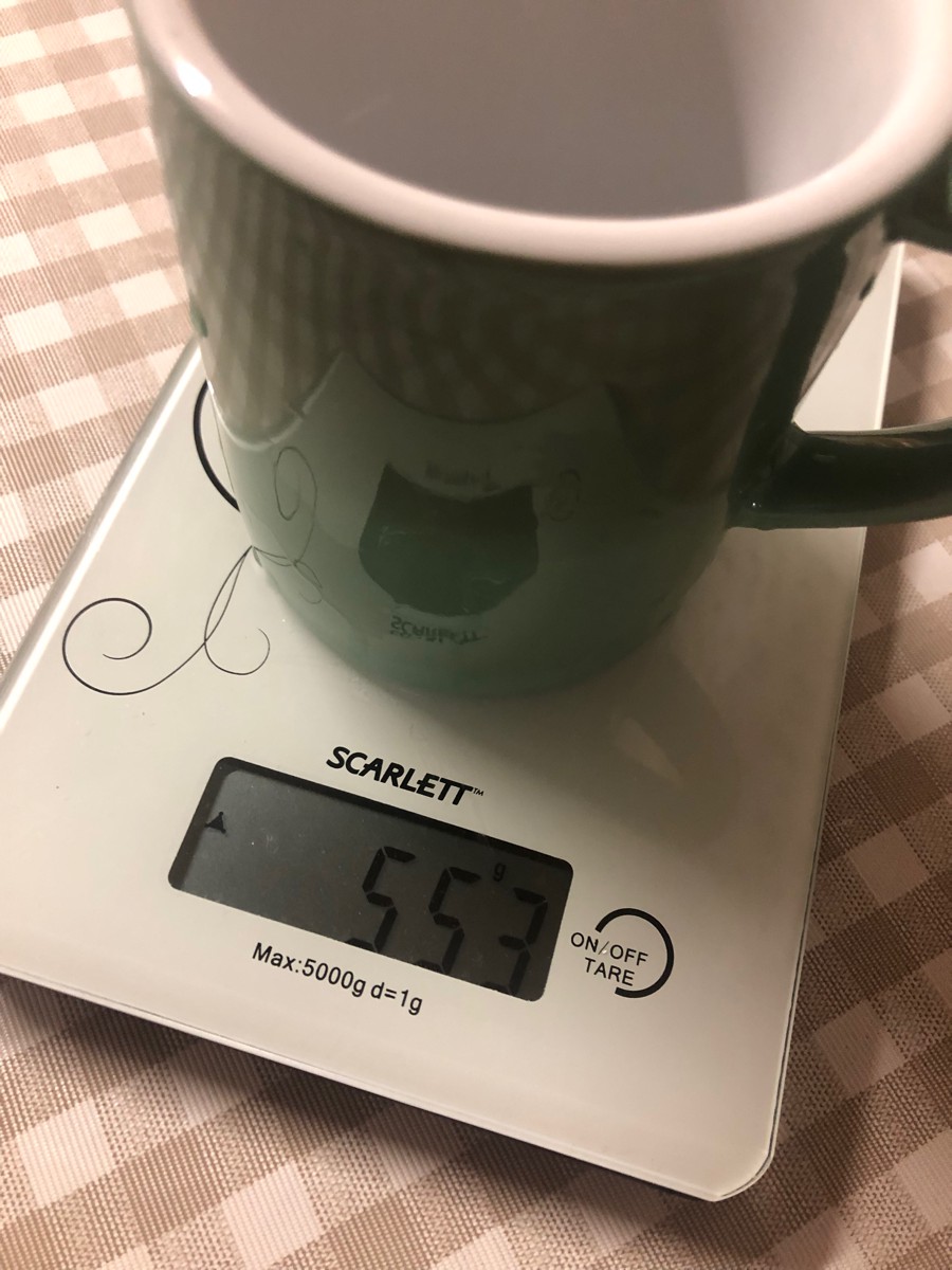 Купил её для заваривания кофе прямо в кружке. На первом фото : 18 гр кофе крупного помола на 300 гр воды, примерно до краёв получается, приложу фото и просто 300 гр воды. Сама кружка весит 543 гр, была хорошо упакована, куплена за 873 р, рекомендую к покупке.