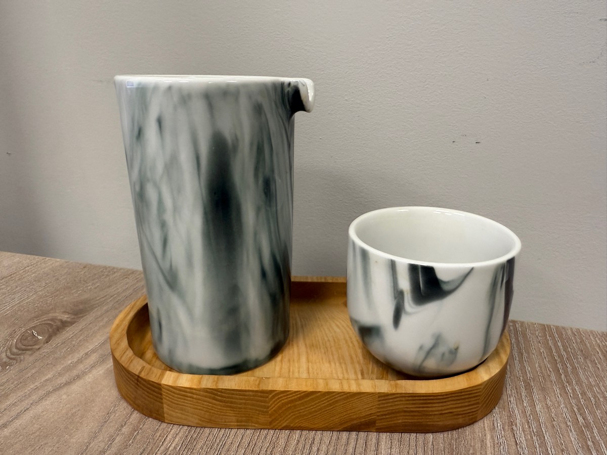 Очень симпатичный сервер, качественная керамика, приятный рисунок, хороший носик. Но пользоваться в реальности неудобно: если объем кофе от 200мл, то наливать его, не обжигая руки, не возможно. Или страдать, или ждать. Переносить тоже только с прихваткой или на подносе. Увы, вещь красивая, но очень не практичная.